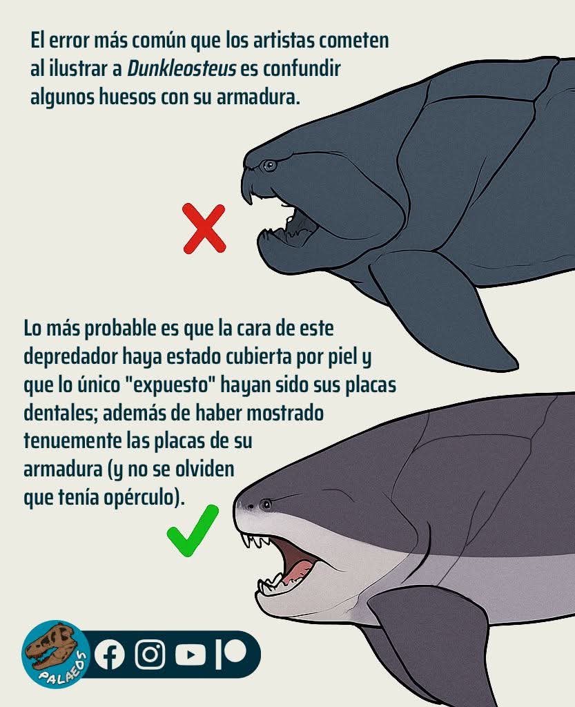 🛡 𝘋𝘶𝘯𝘬𝘭𝘦𝘰𝘴𝘵𝘦𝘶𝘴 tenía armadura, sí.👄 ¿Esta era visible? Lo más probable es que sí (incluso quizá más pronunciado que en la imagen de abajo), pero su cara estaría cubierta por tejido.🤷‍♂️ ¿Cuánto? No lo sabemos con exactitud, pero usando de análogos a los peces modernos podemos recrear su estructura con bastante fidelidad.🦷 Recordemos que esos «dientes» son en realidad placas óseas (placas gnatíferas), por lo que no estarían expuestos. Y no olvidemos que: 1) tenía narinas (sí, los 𝘱𝘦𝘤𝘦𝘴 huelen con su nariz con doble agujero) y 2) tenía un opérculo detrás de la mandíbula (que sacaba el agua que ya había pasado por sus branquias desde su boca).😉 Así que a ponerle un poco más de tejido, pero sin hacerlo un blobfish.
