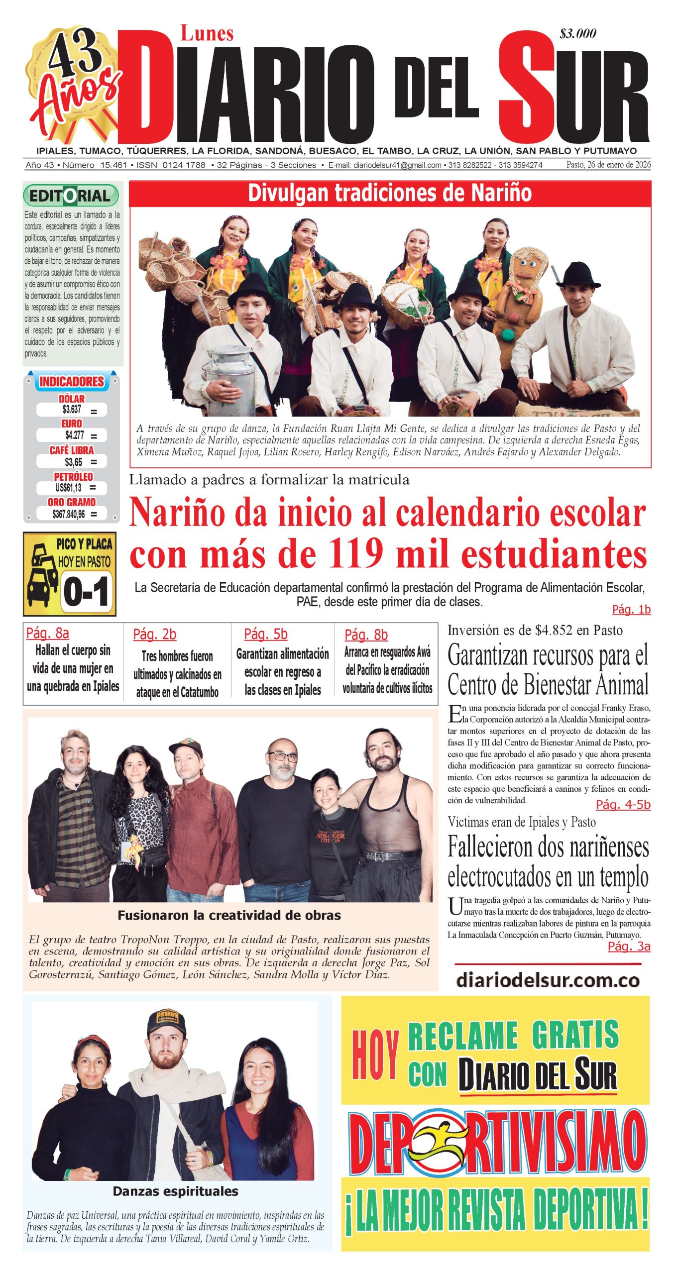 Noticias del Sur Occidente Colombiano DIARIO DEL SUR comparte con ustedes la portada en su edición impresa del 26 de enero de 2026. Los invitamos a adquirir nuestra edición impresa, lo llevamos a la puerta de su casa. Llámanos al 313 8282522