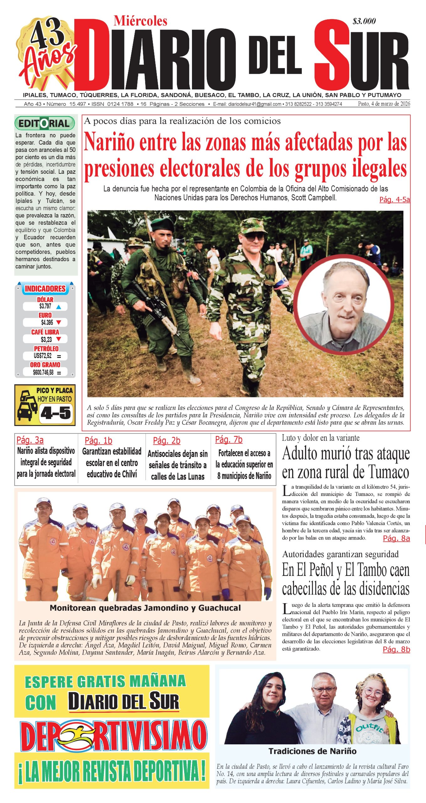 Noticias del Sur Occidente Colombiano DIARIO DEL SUR comparte con ustedes la portada en su edición impresa del 4 de marzo de 2026. Los invitamos a adquirir nuestra edición impresa, lo llevamos a la puerta de su casa. Llámanos al 313 8282522