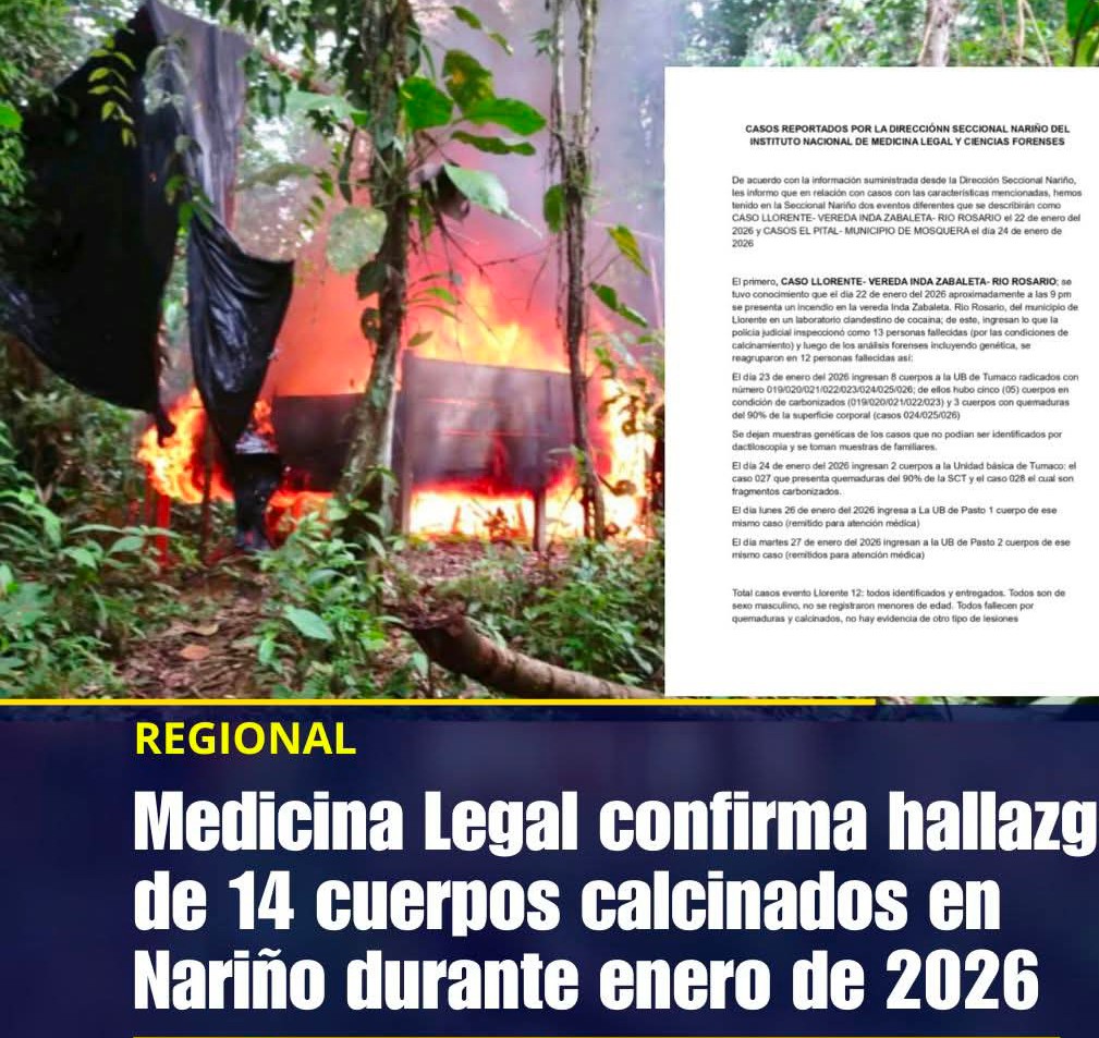 El Instituto Nacional de Medicina Legal y Ciencias Forenses confirmó que 14 cuerpos calcinados fueron encontrados en la zona de frontera entre Colombia y Ecuador, en Nariño, durante enero de 2026. Los cuerpos fueron hallados en dos lugares: 12 en la vereda Inda Zabaleta, en un laboratorio de cocaína incendiado, y 2 en la vereda […]