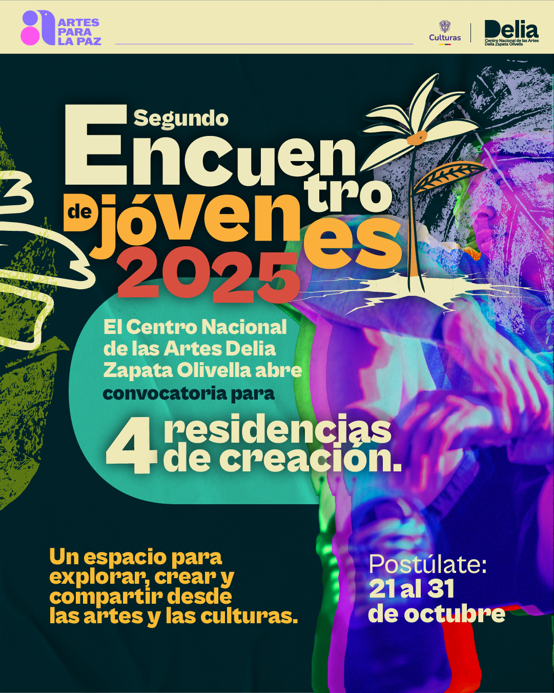 La convocatoria, parte del programa Artes para la Paz, está dirigida a jóvenes entre los 18 y 28 años de todo el territorio nacional y permanecerá abierta hasta el viernes 31 de octubre de 2025.