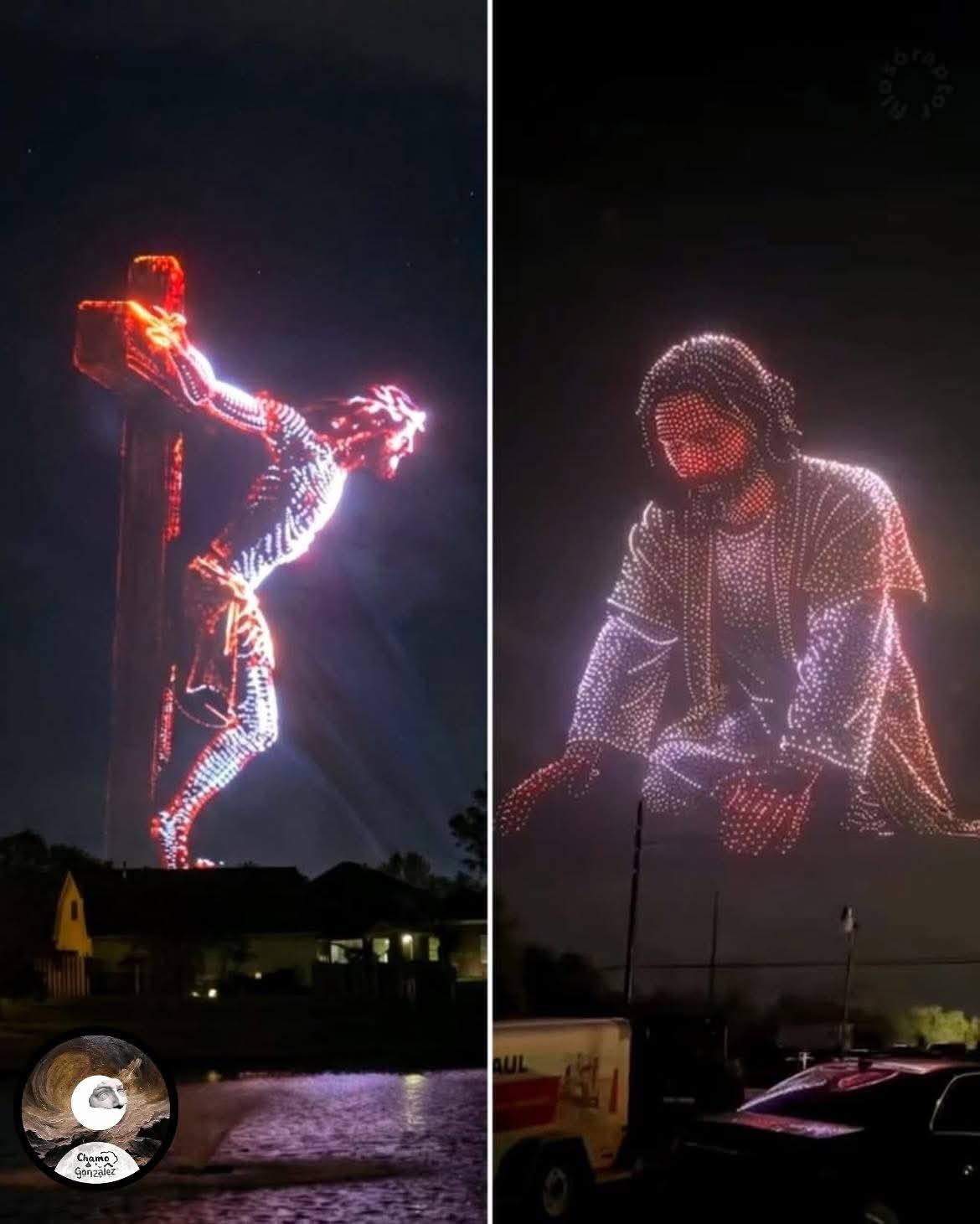 IMPRESIONANTE, PARA APLAUDIR!!! 🇺🇲👏En Texas, un espectáculo con miles de drones recientemente iluminó el cielo formando la figura de Jesús en posición de oraciónEl show, realizado durante el evento gratuito “Jesús, Jesús, Jesús”, estuvo acompañado de música como parte de las celebraciones de Semana Santa 2026