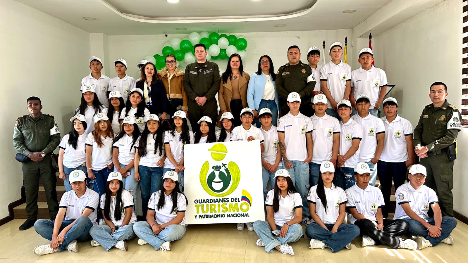 Con este lanzamiento, el municipio de Ipiales avanza en la promoción del turismo responsable y en la formación de nuevas generaciones comprometidas con la protección y valoración del patrimonio nacional. De izquierda a derecha: el subintendente Ediel Araujo, las magister Claudia Calvache y Liliana Coral, la instructora Ofelia Carpio, el teniente coronel Francisco Bohórquez, la instructora Meggie Maya, los estudiantes Estaban Canacuan, Danna Pardo, Jhojan Mallama, Jorge Caicedo, Karen Chaspuengal, Lina Irua, Luis Pantoja, Samuel Gelpud, Subintendente Diego Gálvez Raiderson Mueses, Jeison Quenguan, Yorline Hernández, Astrid Gelpud, Ayelen Benavides, Britany Cuastumal, Darly Atiz, Eider Cuasapaz, Luz Atis, Sabrina Atis, Tania Cuasapud, Sebastián Tobar, Anderson Chaves, Deisy Putacuar, Diego Chalapud, Eliza Pinchao, Erick Estrada, Kevin Carlosama, Luis Dávila, Nicolás Arias, Sara Figueroa, Valery Pinchao, Jefferson Coral y Subintendente Ediel Araujo
