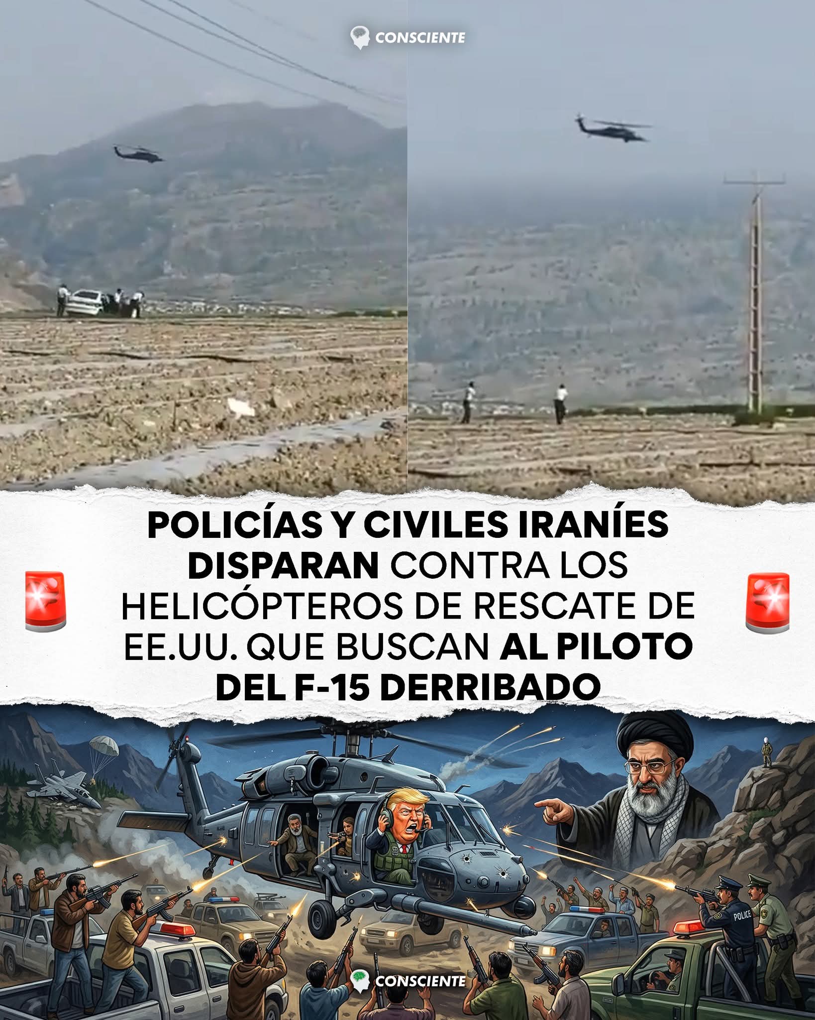 🇮🇷🚁 POLICÍAS Y CIVILES IRANÍES DISPARAN CONTRA LOS HELICÓPTEROS DE RESCATE DE EE.UU. QUE BUSCAN AL PILOTO DEL F-15 DERRIBADONo solo el ejército iraní. Policías, civiles y pobladores rurales están disparando contra las aeronaves de rescate estadounidenses. Videos virales muestran policías iraníes con rifles automáticos abriendo fuego contra helicópteros HH-60G Pave Hawk que volaban a baja altitud. La agencia Mehr publicó imágenes de lo que describió como 芦valientes ciudadanos locales disparando contra helicópteros estadounidenses禄. La televisión estatal emitió un mensaje en pantalla que decía: 芦Dispárenles si los ven禄.🚗 Cientos de civiles se movilizaron en autos particulares hacia la zona del impacto en la provincia de Kohgiluyeh y Boyer-Ahmad, una región montañosa y rural de 15,500 km cuadrados. Las fuerzas armadas iraníes pidieron a la población que 芦no permitan que nadie maltrate al piloto禄, pero la recompensa de 10 mil millones de tomanes (unos 60,000 dólares) por capturarlo con vida desató una cacería popular.🚁 Uno de los Pave Hawk fue alcanzado y se le vio con humo negro cruzando hacia Irak. Los dos Black Hawk que participaban en la misión fueron impactados por fuego iraní, hiriendo a sus tripulaciones. Ambos lograron regresar a su base. Un A-10C Thunderbolt II que escoltaba la operación también fue alcanzado y su piloto tuvo que eyectar sobre Kuwait.Mientras tanto, la agencia Tasnim afirmó que 芦los intentos estadounidenses de rescatar al piloto han fracasado禄. Ghalibaf, presidente del parlamento iraní, se burló: 芦Esta brillante guerra sin estrategia pasó de ‘cambio de régimen’ a ‘Oigan, alguien puede encontrar a nuestros pilotos?'禄