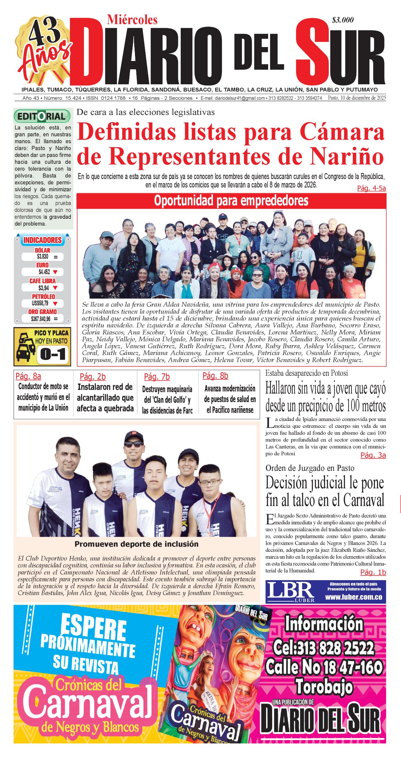 Noticias del Sur Occidente Colombiano DIARIO DEL SUR comparte con ustedes la portada en su edición impresa del 10 de diciembre de 2025.