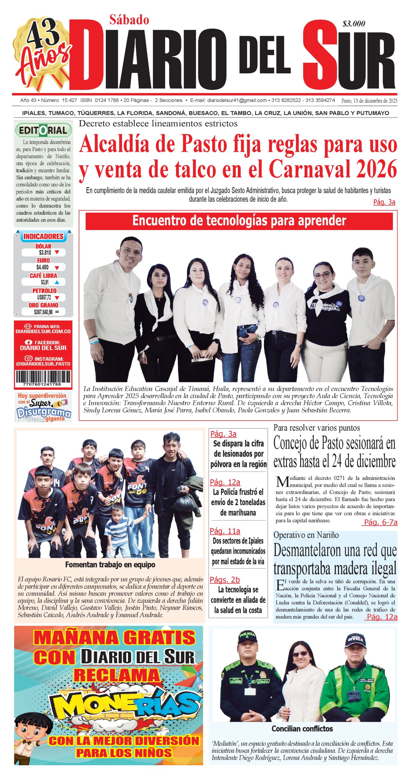 Noticias del Sur Occidente Colombiano DIARIO DEL SUR comparte con ustedes la portada en su edición impresa del 13 de diciembre de 2025.