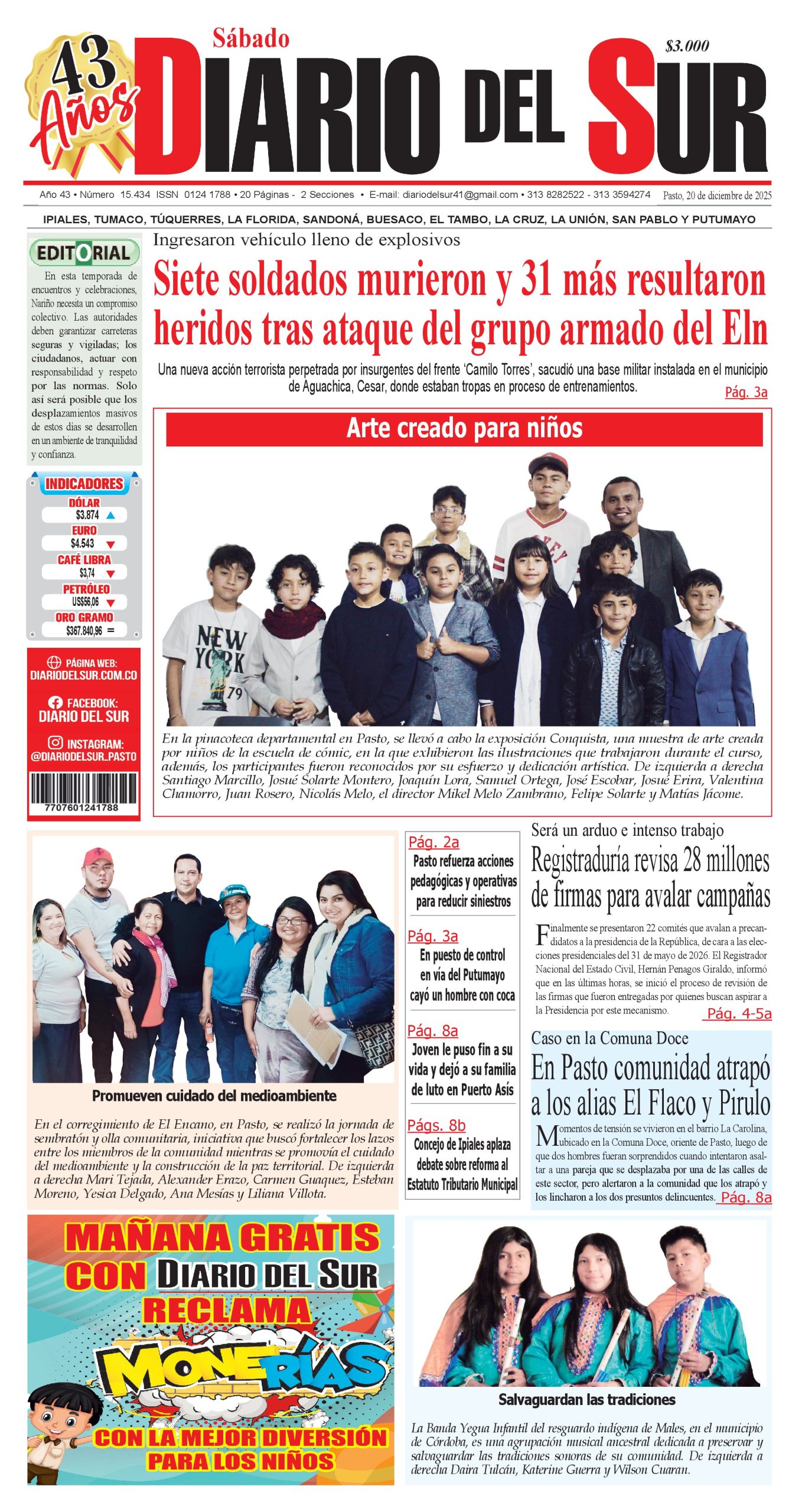 Noticias del Sur Occidente Colombiano DIARIO DEL SUR comparte con ustedes la portada en su edición impresa del 20 de diciembre de 2025.