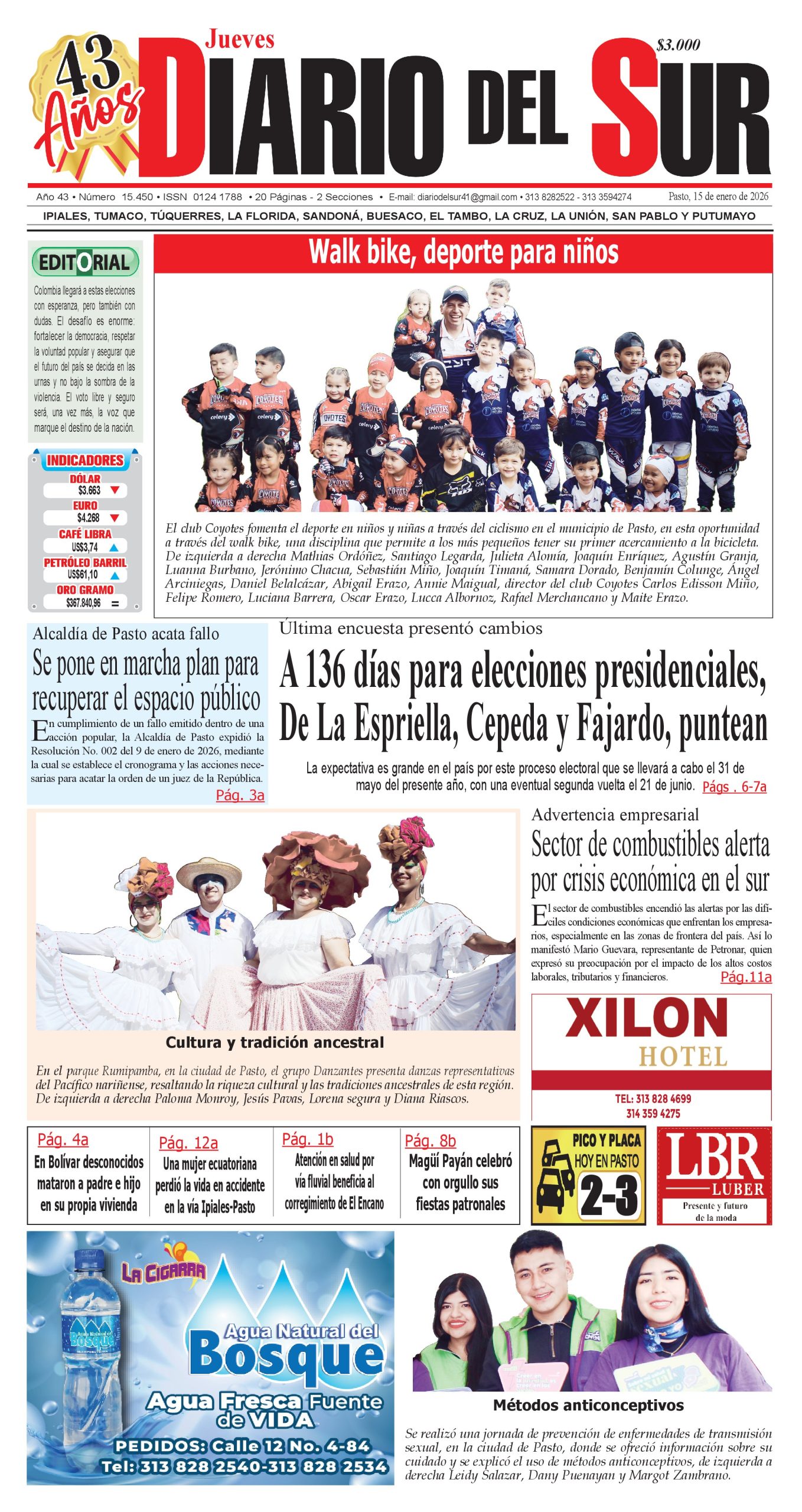 Noticias del Sur Occidente Colombiano DIARIO DEL SUR comparte con ustedes la portada en su edición impresa del 15 de enero de 2026.