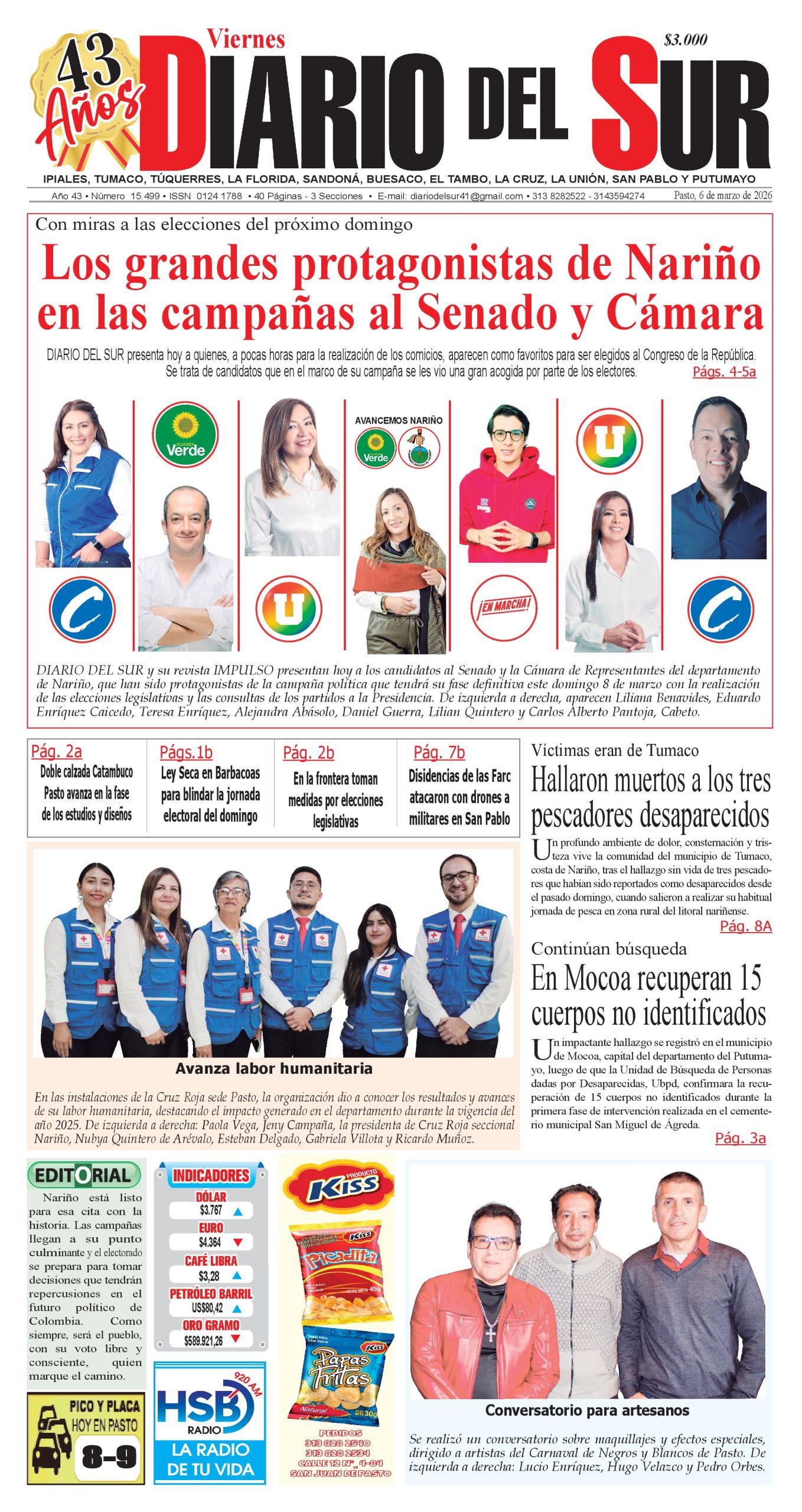 Noticias del Sur Occidente Colombiano DIARIO DEL SUR comparte con ustedes la portada en su edición impresa del 6 de marzo de 2026.