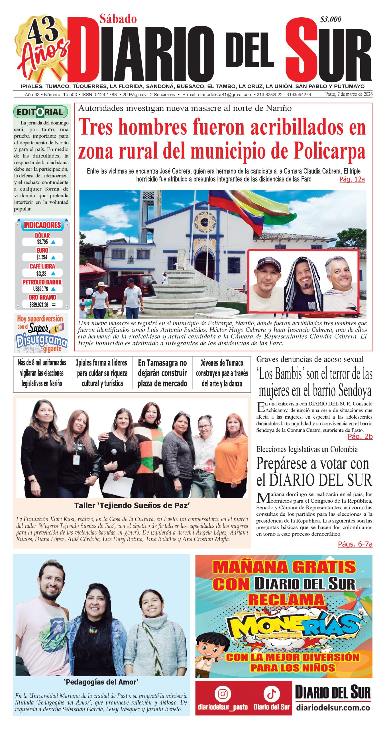 Noticias del Sur Occidente Colombiano DIARIO DEL SUR comparte con ustedes la portada en su edición impresa del 7 de marzo de 2026.