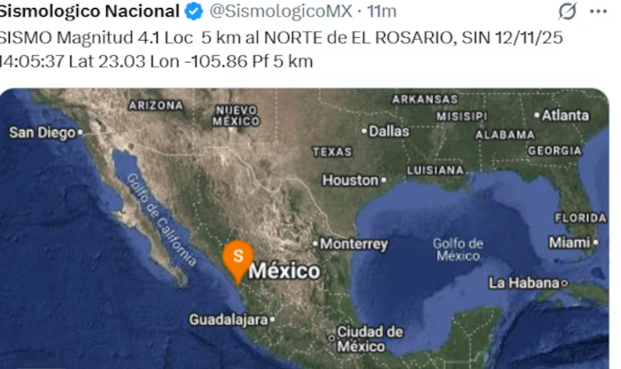 La tarde del miércoles 12 de noviembre de 2025 se registró un sismo de magnitud 4.1 en el estado mexicano de Sinaloa, informó el Servicio Sismológico Nacional (SSN). El epicentro se localizó al norte de la localidad de El Rosario, sin que hasta el momento se reporten daños materiales ni víctimas.