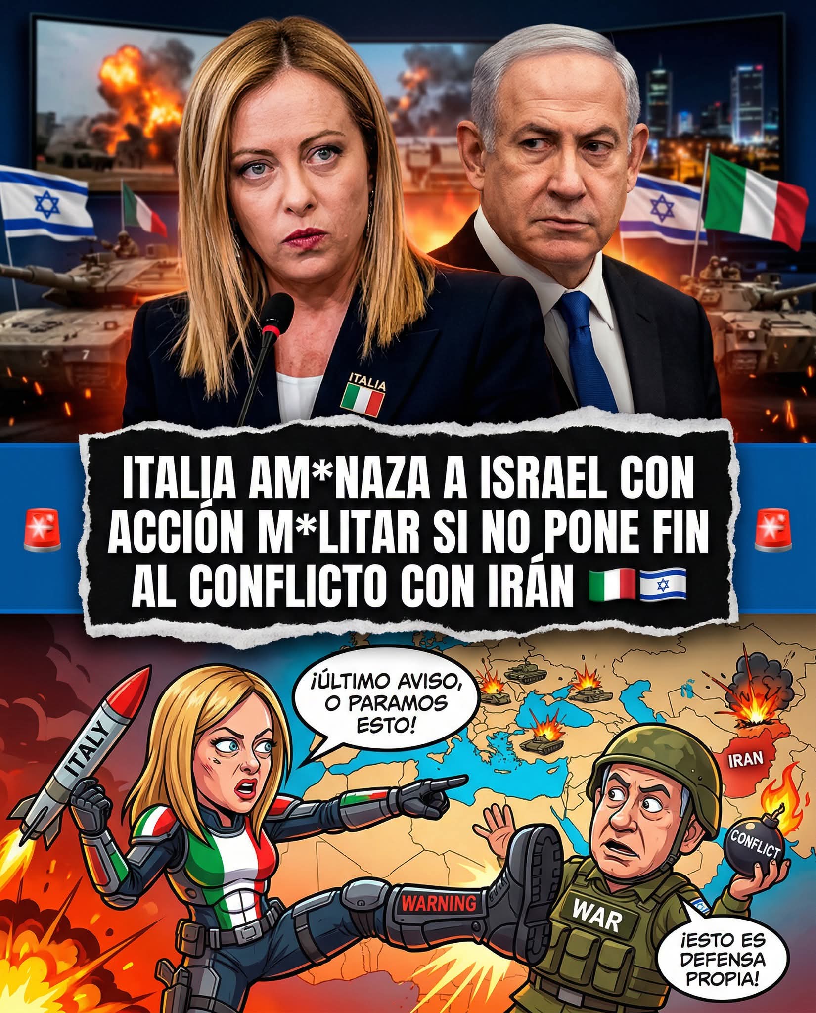 🇮🇹🇮🇱 ¡ULTIMÁTUM HISTÓRICO! ITALIA ROMPE EL SILENCIO Y AM*NAZA CON INTERVENCIÓN M*LITAR ANTE LA ESCALADA CON IRÁNEl tablero internacional acaba de temblar con una declaración que nadie esperaba desde el Palacio Chigi.La primera ministra Giorgia Meloni ha dejado claro que la paciencia de Roma tiene un límite. En un giro diplomático sin precedentes, Italia ha advertido al gobierno de Benjamin Netanyahu que no tolerará una mayor desestabilización en el Mediterráneo y Oriente Medio. La tensión entre Israel e Irán ha alcanzado un punto de no retorno que obliga a las potencias europeas a reevaluar su apoyo incondicional. Roma, tradicionalmente un aliado sólido de Tel Aviv, ahora pone sobre la mesa el uso de sus capacidades de defensa si el c*nflcto no se detiene de inmediato. Esta postura busca frenar un efecto dominó que podría involucrar a toda la región en una g*erra abierta de proporciones catastróficas. La administración de Meloni sabe que el flujo energético y la seguridad migratoria dependen de la paz en esta zona crítica. El despliegue de activos en posiciones estratégicas ya se analiza en los círculos de poder italianos para dar peso a sus palabras frente a la ofensiva de Israel.El equilibrio de la OTAN se pone a prueba; si Italia actúa, el mapa de alianzas occidentales cambiará para siempre.