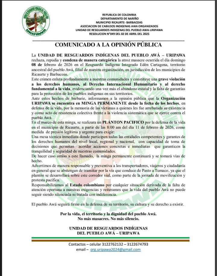 “Responsabilizamos al Estado colombiano por cualquier situación derivada de la falta de atención oportuna a nuestras exigencias. El pueblo Awá seguirá firme en la defensa de su territorio”, indicó el comunicado.